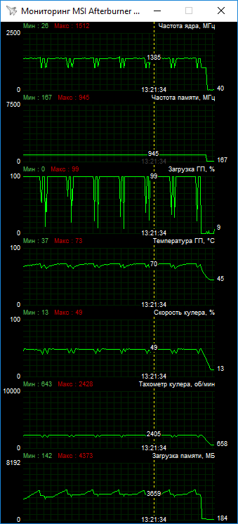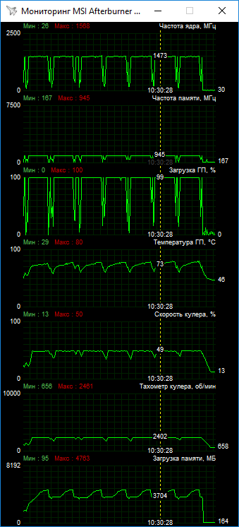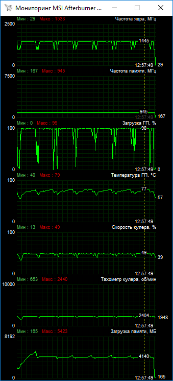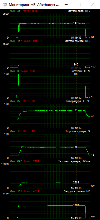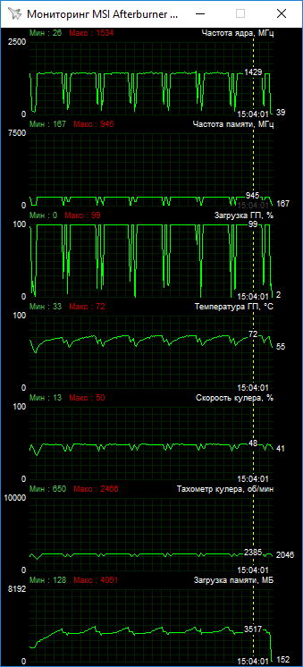 Теперь поговорим о температурных характеристиках и частотах в игровой нагрузке. Все испытания проводились на открытом стенде при температуре внутри помещения 23–24 °C. В данных условиях реальные частоты GPU были ниже уровня 1500 МГц. В тесте Superposition benchmark (Extreme-режим) основной диапазон частот ядра был на уровне 1490–1510 МГц, в тесте Tom Clancy's The Division (2560x1440 Ultra) это 1450–1500 МГц, что проиллюстрировано ниже.