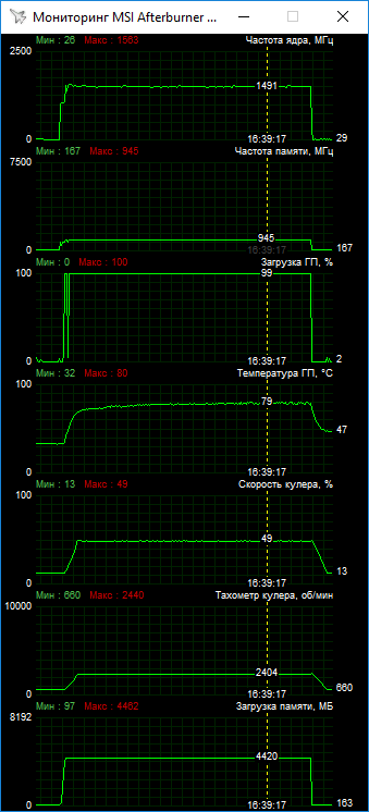 Максимальные температуры ядра при игровой нагрузке на уровне 79–80 °C, а скорость вращения вентилятора до 2400 об/мин. Это весьма неплохие показатели, поскольку референсные GeForce GTX 1080 имеют ограничение по температуре около 82 °C. А благодаря изменчивой скорости вентиляторов реальный уровень шума можно оценить как умеренный.