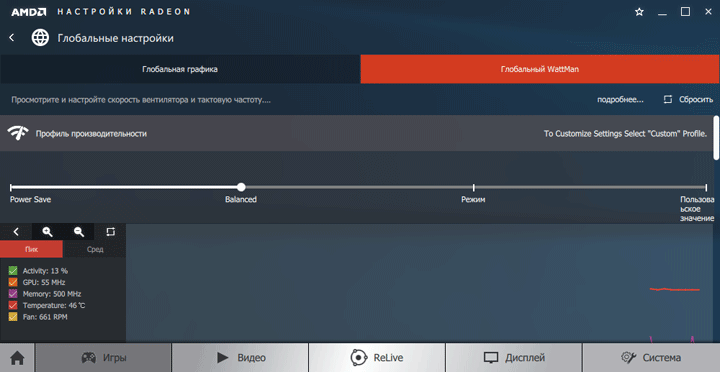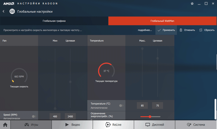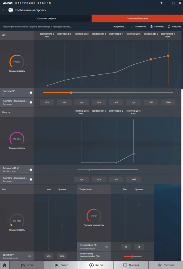 Температурно-шумовые характеристики определяются параметрами, которые доступны для ручной регулировки. Все тонкие настройки присутствуют в приложении AMD Radeon Settings по следующему пути: Игры — Глобальные настройки — Глобальный WattMan (Global WattMan).