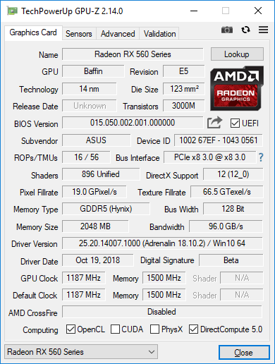 Что касается частот GPU, то у каждого производителя есть аналогичные версии Radeon RX 560 с частотами ниже 1200 МГц. В свое время мы рассматривали похожую видеокарту PowerColor Red Dragon Radeon RX 560 2GB. Но впервые нам попадается вариант с пониженной частотой памяти.