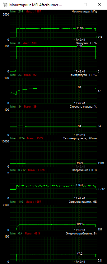 Вентиляторы могли раскручиваться до 1500–1700 об/мин, но быстро стабилизировались на уровне 1300 об/мин при минимальном шуме. Внутри корпуса видеокарта может быть горячее, но явных проблем с шумом явно не будет.