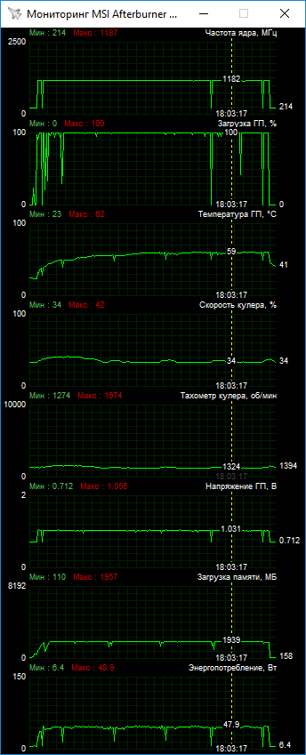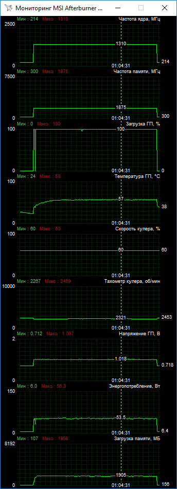 В итоге удалось не только нагнать старшие версии Radeon RX 560, но и обогнать их по частотам. Возможно, такое частотное преимущество как-то компенсирует меньшее число потоковых процессоров у GPU. К сожалению, разгон уже связан с определенным шумом. Для стабилизации на достигнутых частотах пришлось повышать скорость вентиляторов до 2450 об/мин. Если не гнаться за каждым мегагерцом, то можно достичь сбалансированного разгона при чуть меньших частотах и более низкой скорости вентиляторов.
