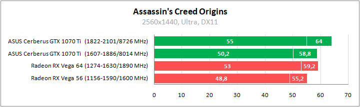 Начальный уровень производительности GeForce GTX 1070 Ti в Assassin's Creed изначально ближе к уровню Radeon RX Vega 64. Разгон позволяет добиться небольшого преимущества над старшим конкурентом.