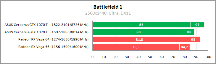 В Battlefield 1 видеоадаптер GeForce GTX 1070 Ti показывает более высокие результаты относительно Radeon RX Vega 56, но проигрывает Radeon RX Vega 64. Разгон позволяет добиться лидерства.