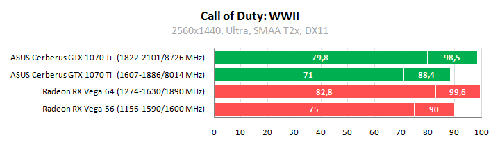 В последней игре серии Call of Duty герой обзора занимает последнее место, хотя после разгона приближается к уровню Radeon RX Vega 64. Сам разгон обеспечивает ASUS ускорение до 12%.