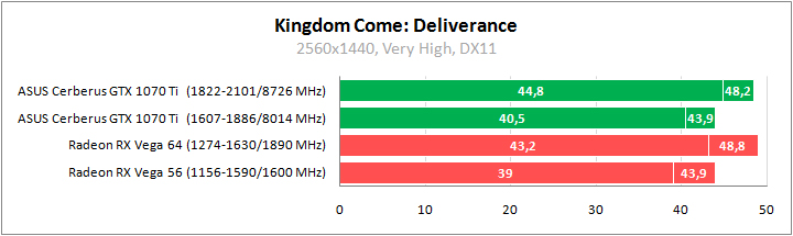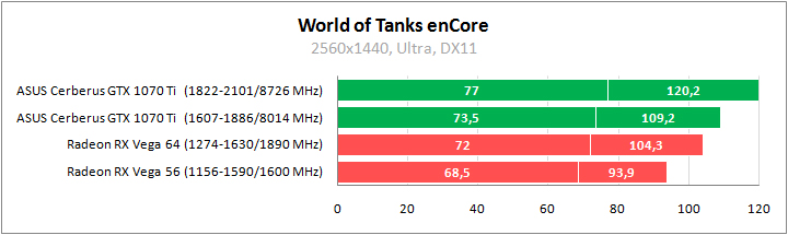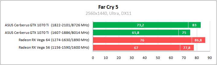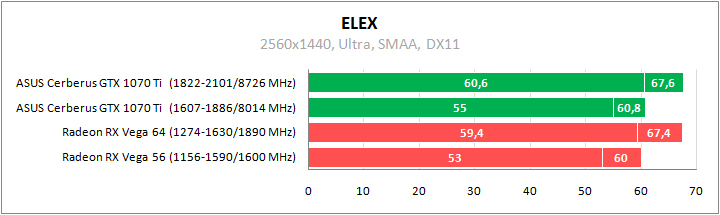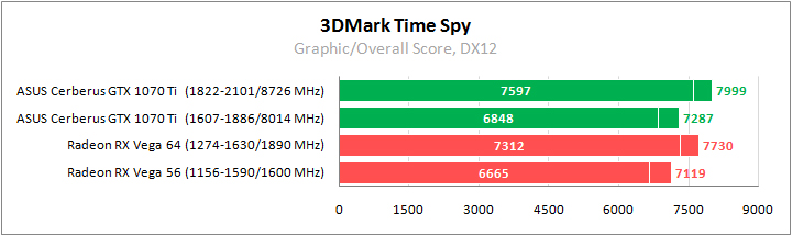 Привычное преимущество GeForce GTX 1070 Ti над Radeon RX Vega 56, но с весьма скромной разницей. В разгоне ASUS соперничает со старшим Radeon RX Vega 64.