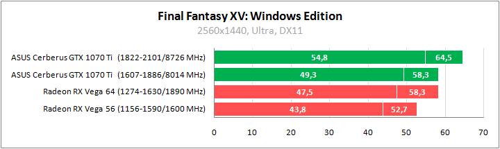 В Final Fantasy явно доминирует GeForce GTX 1070 Ti. Герой обзора изначально быстрее всех конкурентов AMD, а разгон увеличивает отрыв.
