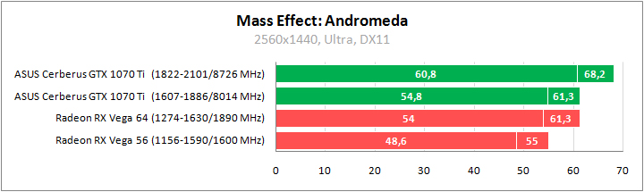 В Andromeda герой обзора изначально показывает производительность на уровне флагмана AMD. Разгон обеспечивает дополнительное ускорение в 11%.
