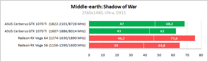 Схожие результаты у GeForce GTX 1070 Ti и Radeon RX Vega 56 в Shadow of War. Прирост от разгона 10%, что позволяет приблизиться к флагману AMD.