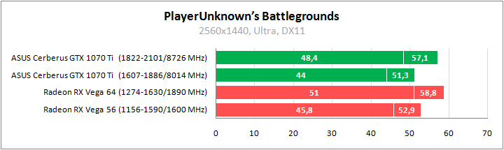 В номинале у ASUS GeForce GTX 1070 Ti результаты на уровне Radeon RX Vega 56 с небольшим преимуществом по минимальному fps. В разгоне герой обзора вновь является конкурентом для Radeon RX Vega 64. С учетом общей нестабильной производительности в игре это соотношение может легко измениться в пользу AMD при каких-то иных условиях.