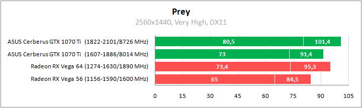 ASUS GeForce GTX 1070 Ti почти не уступает Radeon RX Vega 64 в Prey. Разгон придает ускорение более 10%.