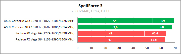 Результаты в SpellForce 3 немного странные из-за минимальной реакции на разгон. Похоже, тут системы упираются в возможности процессора или какие-то проблемы с оптимизацией. Но хорошо видно преимущество GeForce GTX 1070 Ti над решениями AMD.