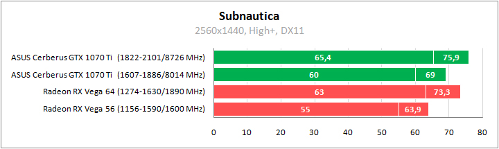 В подводном выживании Subnautica герой обзора занимает промежуточную позицию между видеоадаптерами AMD. При максимальных частотах GeForce GTX 1070 Ti обгоняет референсный Radeon RX Vega 64 на 3–4%.