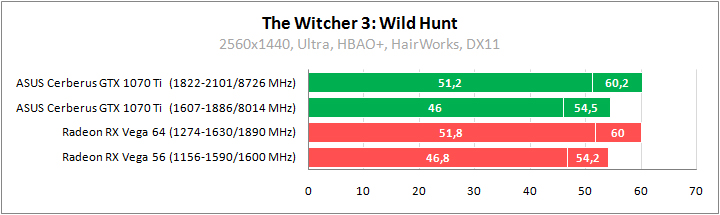 При максимальных настройках в Witcher 3 мы видим паритет между GeForce GTX 1070 Ti и Radeon RX Vega 56. Разгон ускоряет ASUS на 11%, позволяя нагнать Radeon RX Vega 64.