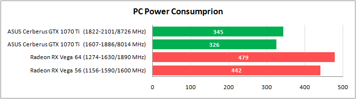 Система с GeForce GTX 1070 Ti потребляет заметно меньше в сравнении с конфигурациями на базе Radeon RX Vega.