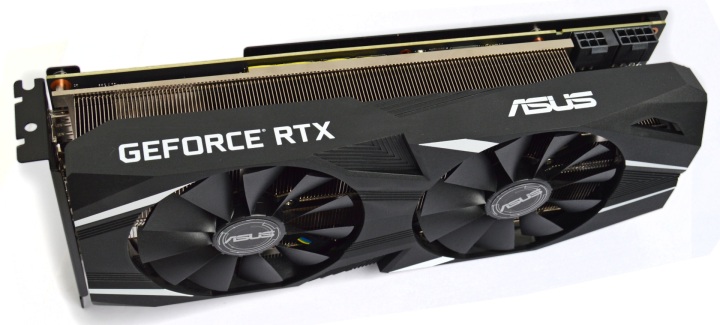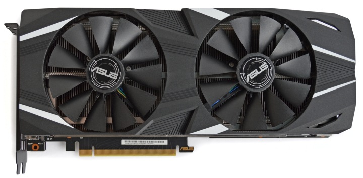 Визуально ASUS Dual GeForce RTX 2070 OC ничем не отличается от ранее рассмотренной видеокарты ASUS Dual GeForce RTX 2080. Перед нами массивное трехслотовое устройство с парой больших вентиляторов. Под кожухом виден большой радиатор, занимающий основной объем. Длина около 27 см.