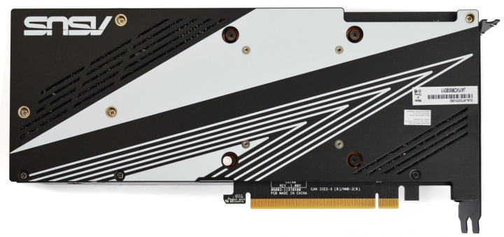 На боковую грань кожуха нанесены логотипы GeForce RTX и ASUS. В углу есть два разъема питания — на шесть и восемь контактов.