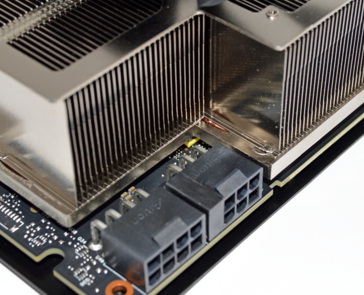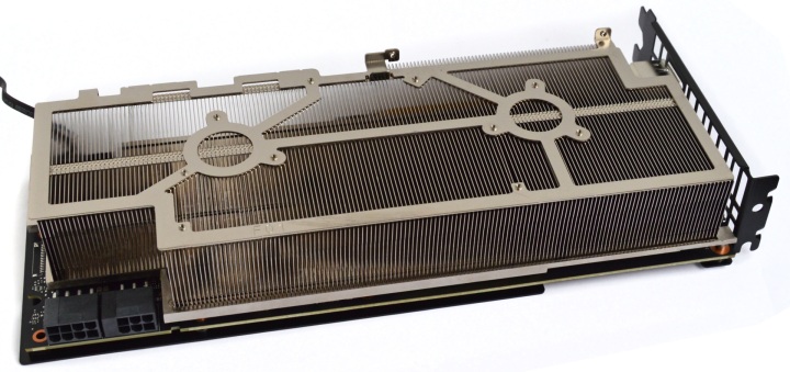 Радиатор имеет толстое массивное основание, а сверху ряд пластин. Это очень крупная конструкция, но без тепловых трубок. Такое же охлаждение задействовано в GeForce RTX 2080 линейки Dual.
