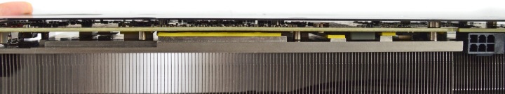 На основании есть площадки для теплового контакта с разными элементами на плате. Тут явно используется единый радиатор для GPU, памяти и элементов питающей цепи. В качестве термоинтерфейса задействованы желтые прокладки.