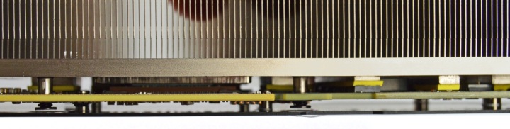 Внутри толстого основания действительно находится или крупная испарительная камера или несколько изогнутых тепловых трубок. Они обеспечивают отвод тепла от контактной площадки основания ко всем пластинам радиатора. О детальном устройстве охлаждения остается только гадать. Но, как мы увидим ниже, оно весьма эффективно. Также нужно отметить, что усилительная пластина не имеет термопрокладок и не охлаждает напрямую плату, хотя это стало стандартным для многих моделей GeForce RTX.