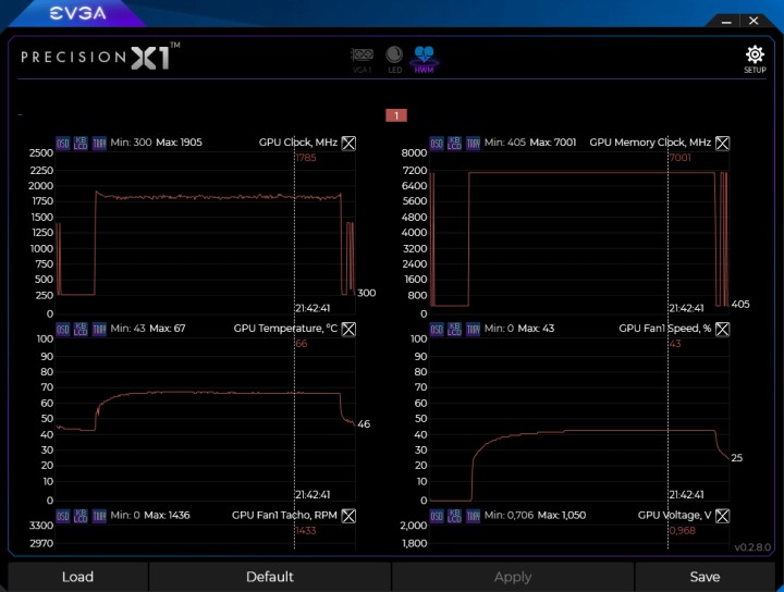 При тестировании в Shadow of the Tomb Raider в разрешении WQHD средние частоты GPU были ближе к 1830 МГц, пиковая температура до 68 °С. Пиковые значения Boost — до 1905 МГц.