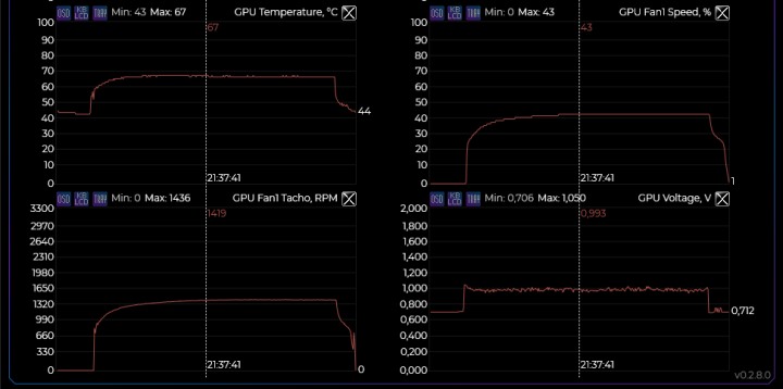 Температура ядра не превышала 67 °С при тестировании на открытом стенде (внутри помещения 20 °С). Скорость вращения вентиляторов около 1400 об/мин или чуть выше.