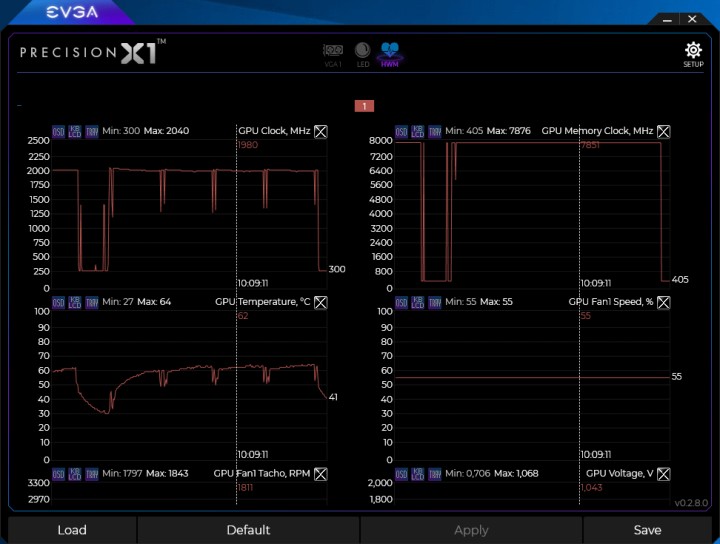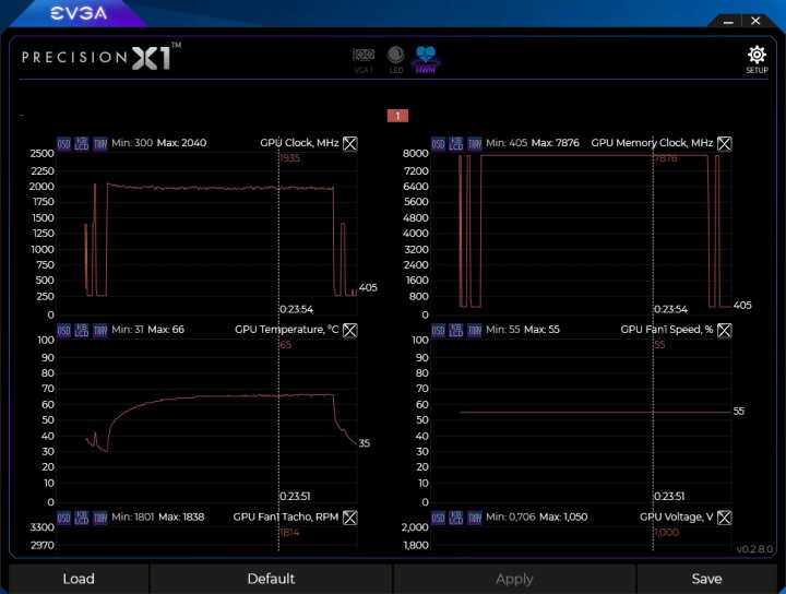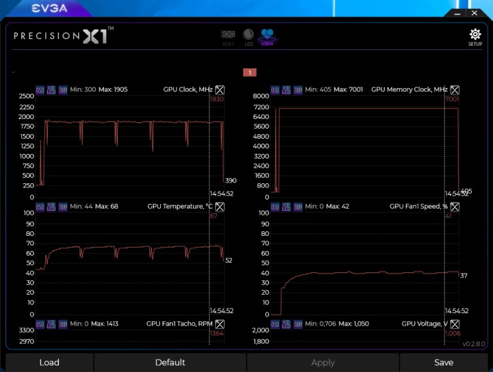 В Final Fantasy XV при разгоне частоты варьировались в диапазоне 1935–1980 МГц. Ускоритель MSI GeForce RTX 2070 в этом же тесте при более высоком базовом значении показывал на 100 МГц меньше. Память удалось разогнать до 15752 МГц, что немного ниже в сравнении с MSI.