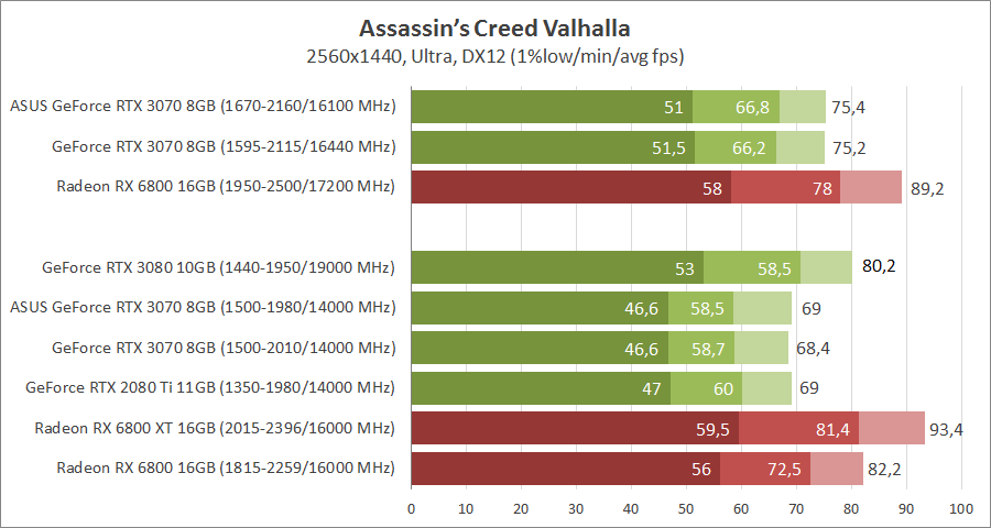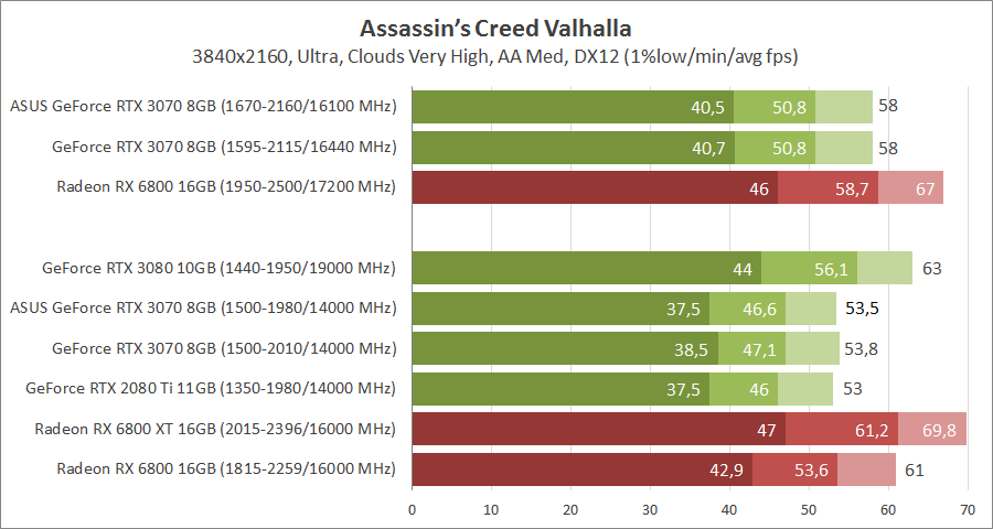 Лучшие результаты в Valhalla обеспечивают видеокарты AMD. Любые версии GeForce RTX 3070 безнадежно уступают Radeon RX 6800.