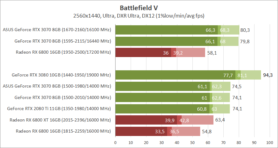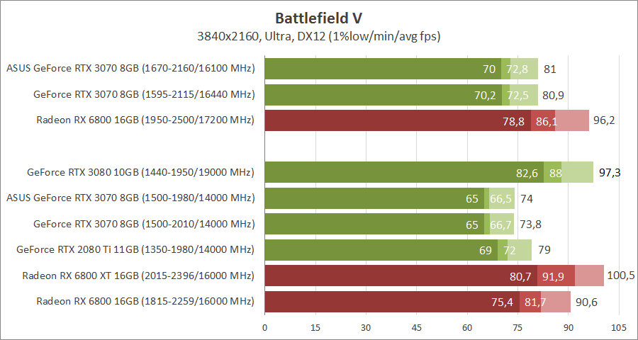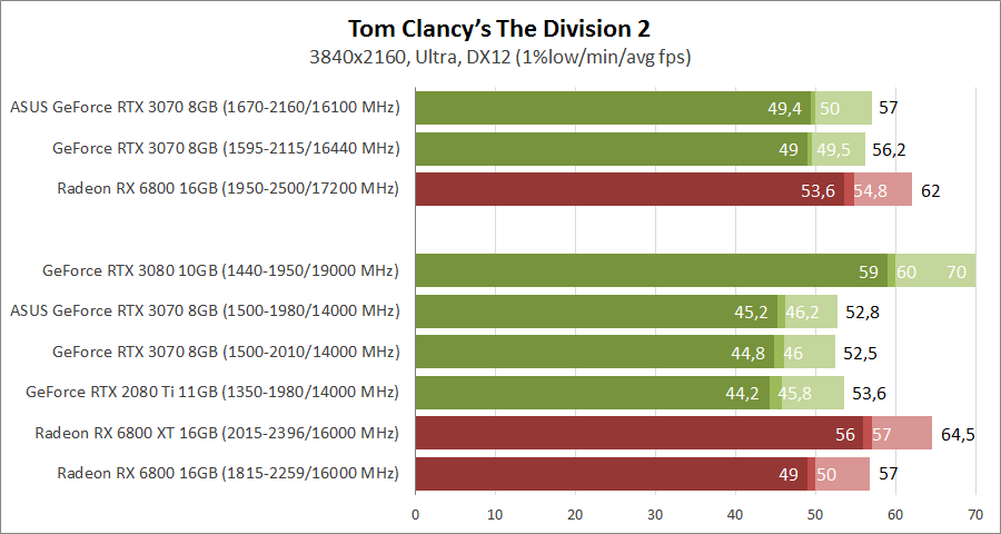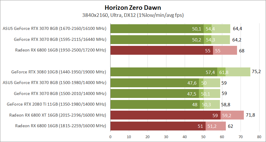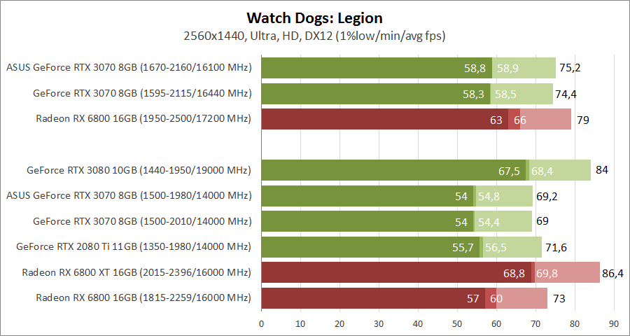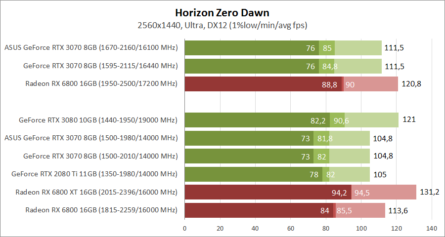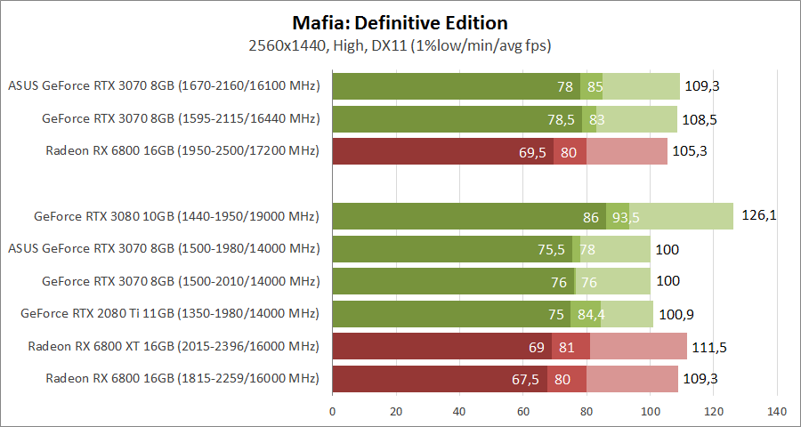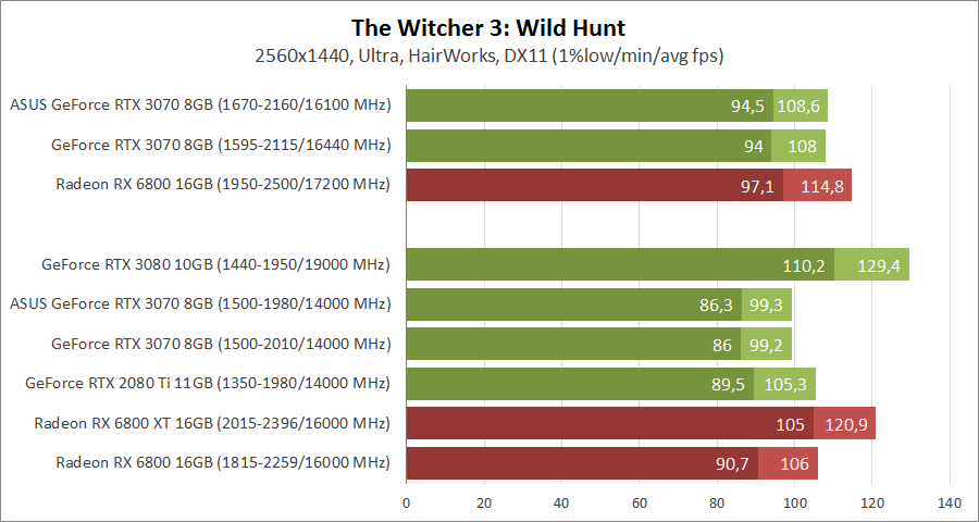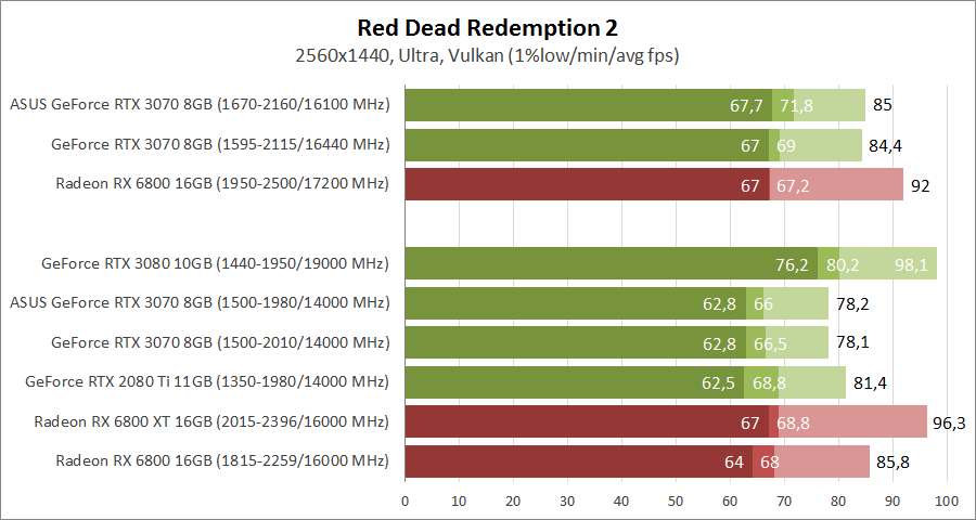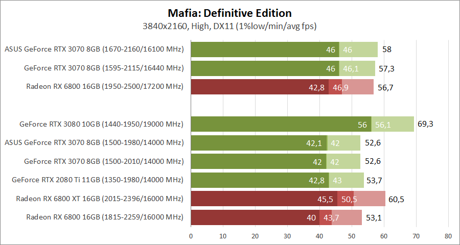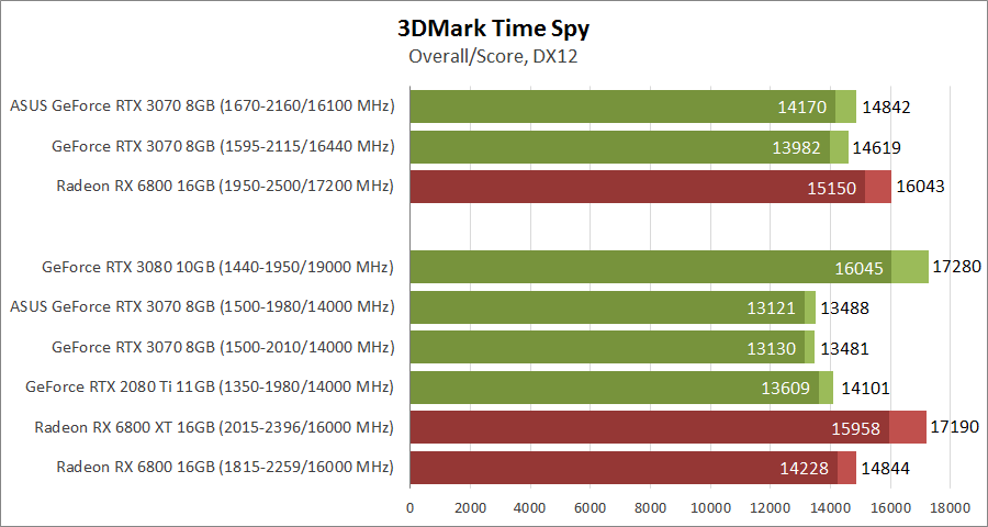 Максимально близкие результаты у GeForce RTX 3070 и GeForce RTX 2080 Ti при небольшом отставании от Radeon RX 6800. Разгон серьезно снижает отставание от Radeon RX 6800 XT.