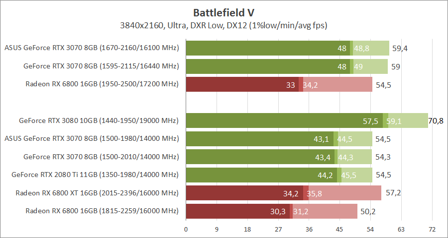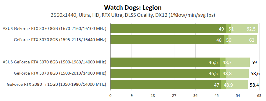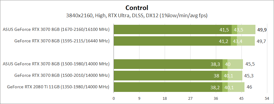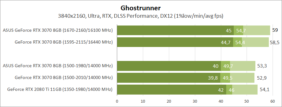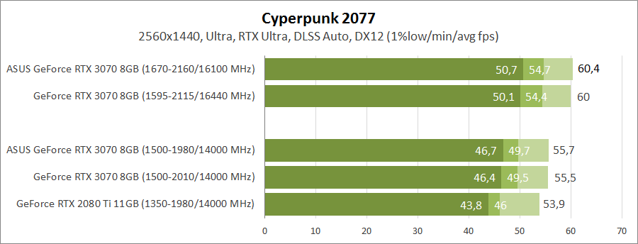 Играть в 4K с RTX-настройками возможно при дополнительной активации DLSS. Преимущество ASUS над референсным вариантом GeForce RTX 3070 минимально.