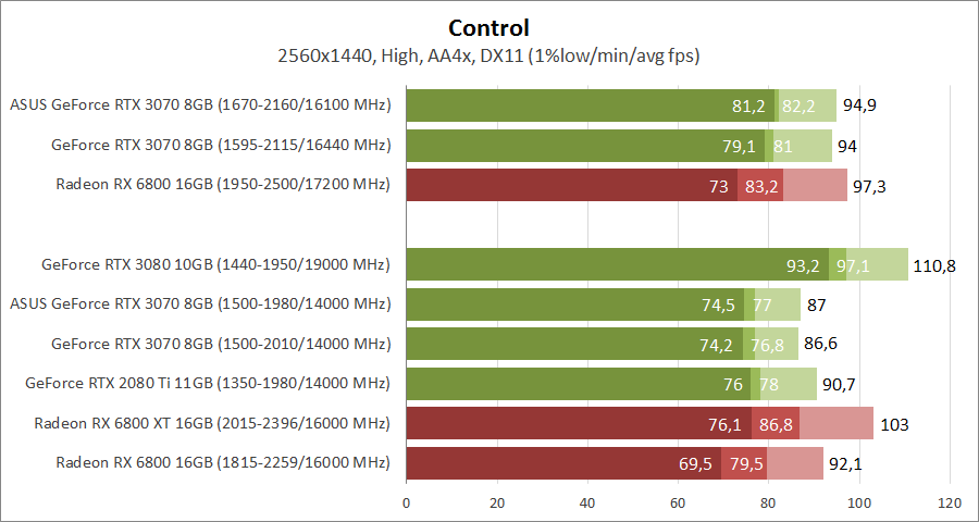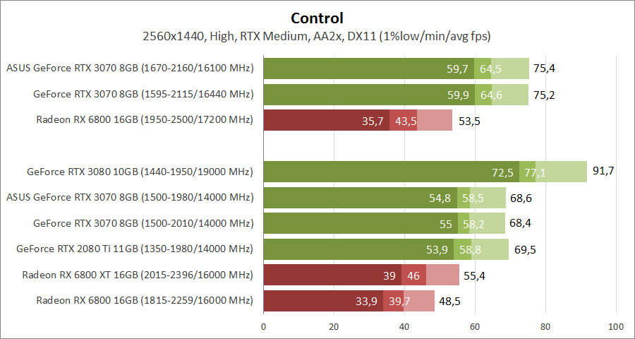 Расстановку сил в Control можно назвать стандартной. В обычном режиме Radeon RX 6800 быстрее GeForce RTX 3070, но с трассировкой решения NVIDIA уверенно обгоняют конкурентов. И если Radeon RX 6800 с RTX-эффектами едва вытягивает игру, то GeForce RTX 3070 обеспечивает полный комфорт с производительностью более 60 fps.