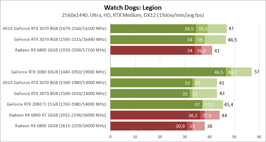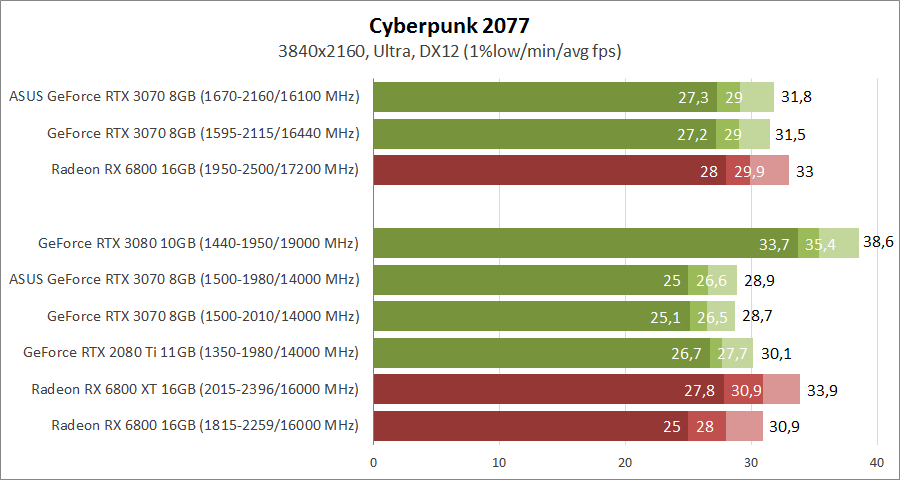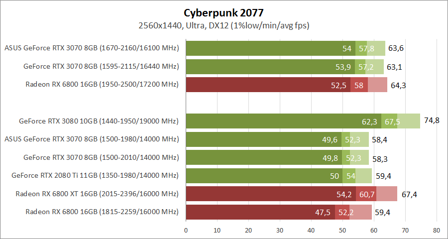 Тесты в Cyberpunk 2077 проводились до обновления 1.2. GeForce RTX 3070 позволяет комфортно играть в 1440p в обычном режиме без трассировки, минимально уступая Radeon RX 6800.