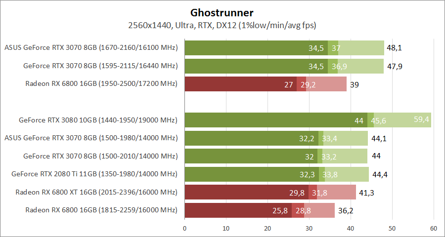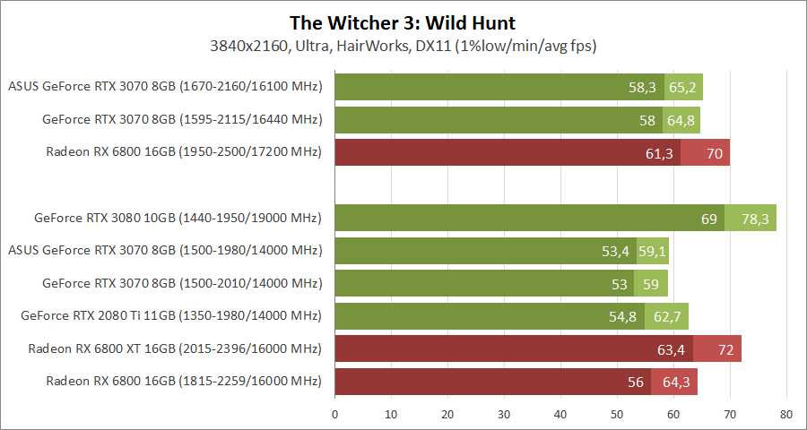 Одинаковые результаты у обоих GeForce RTX 3070, мизерное преимущество ASUS заметно только в 4K. Оба варианта уступают Radeon RX 6800.