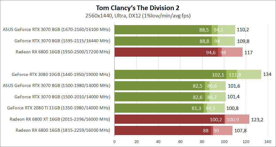GeForce RTX 3070 проигрывает Radeon RX 6800 во всех режимах. Более высокие результаты и у GeForce RTX 2080 Ti, но с мизерным отрывом. Показатели ASUS минимально отличаются от референса. Ускорение от разгона до 9%.