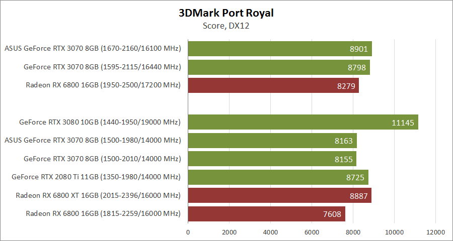 В тесте Port Royal с трассировкой лучей GeForce RTX 3070 сразу демонстрирует превосходство над основным соперником AMD.
