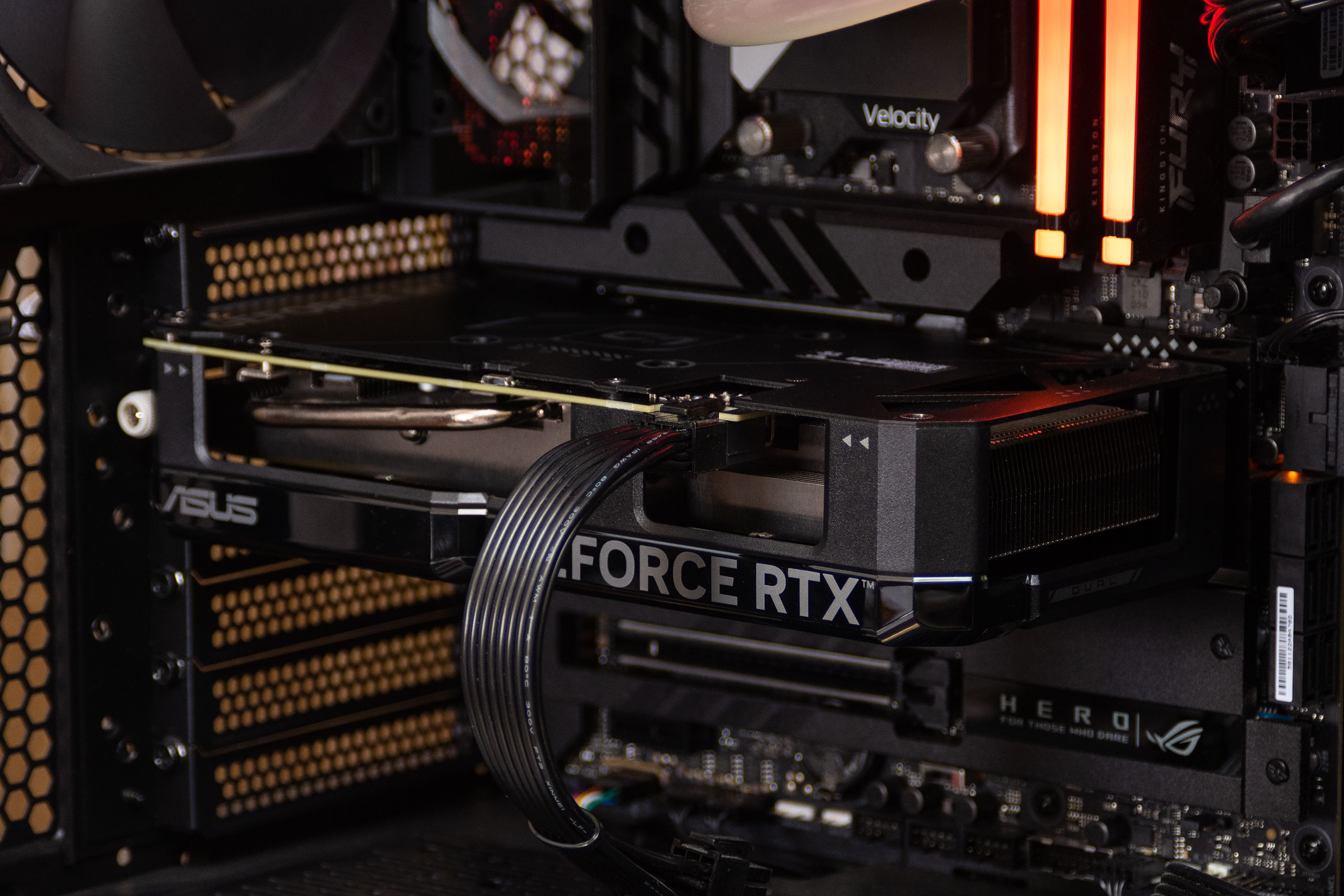 На интерфейсной планке есть три разъема DisplayPort 1.4a и один HDMI 2.1a. Также на нем присутствуют большие отверстия для прохождения воздуха.