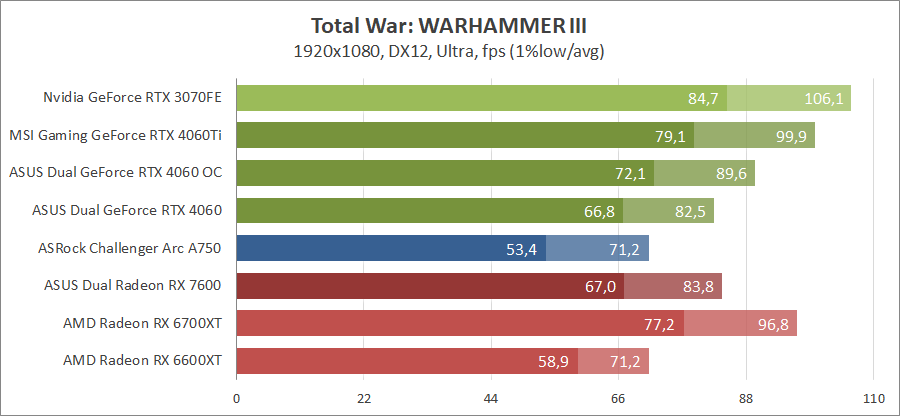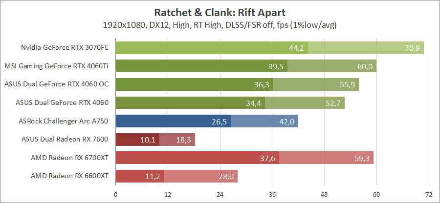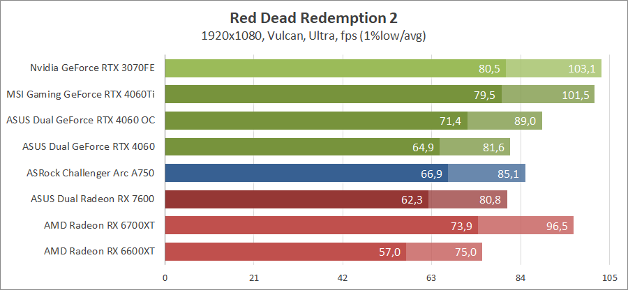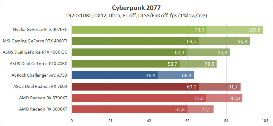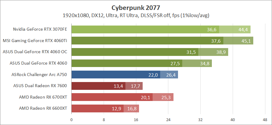 Здесь новинка демонстрирует быстродействие на уровне между старым и новым Radeon аналогичного класса, активирование лучей позволяет сравниться с Radeon RX 6700 XT.
