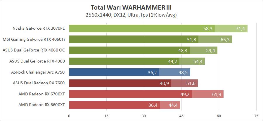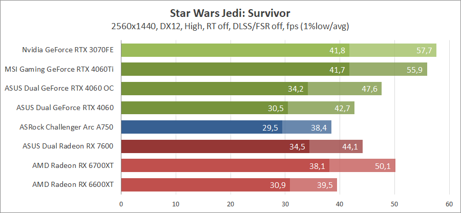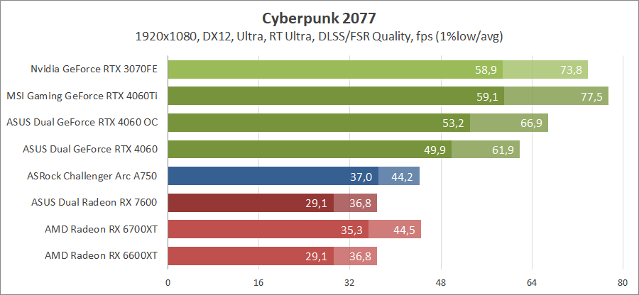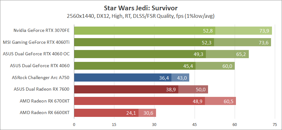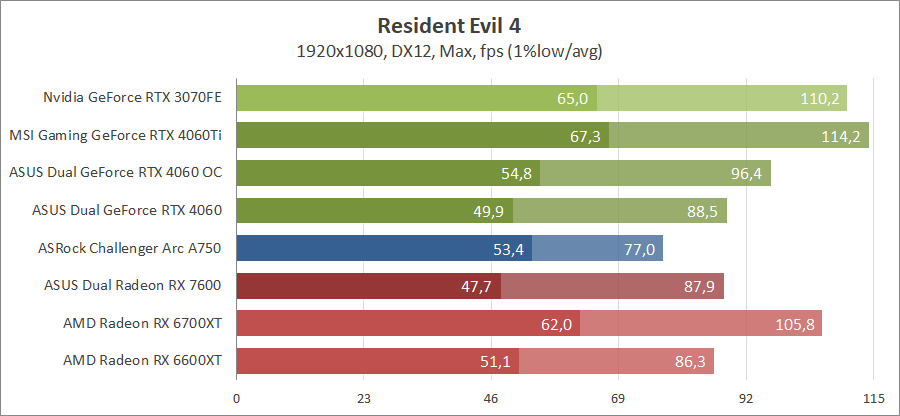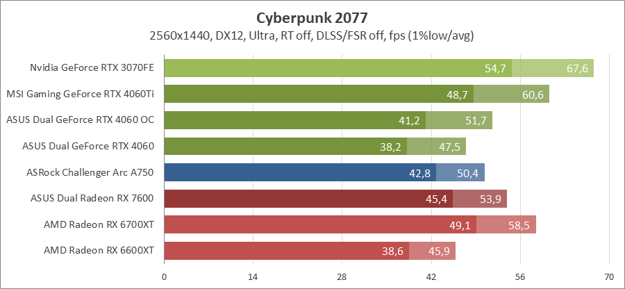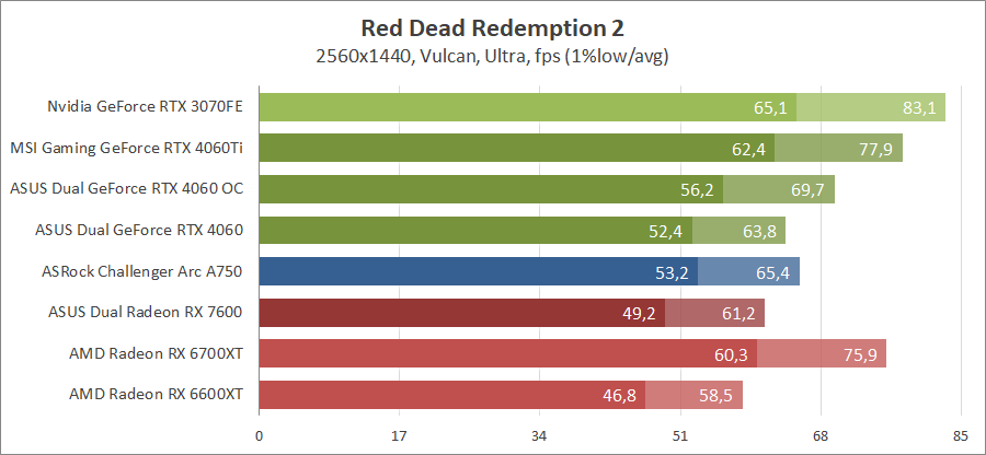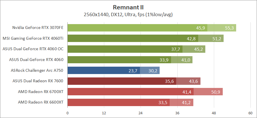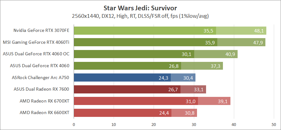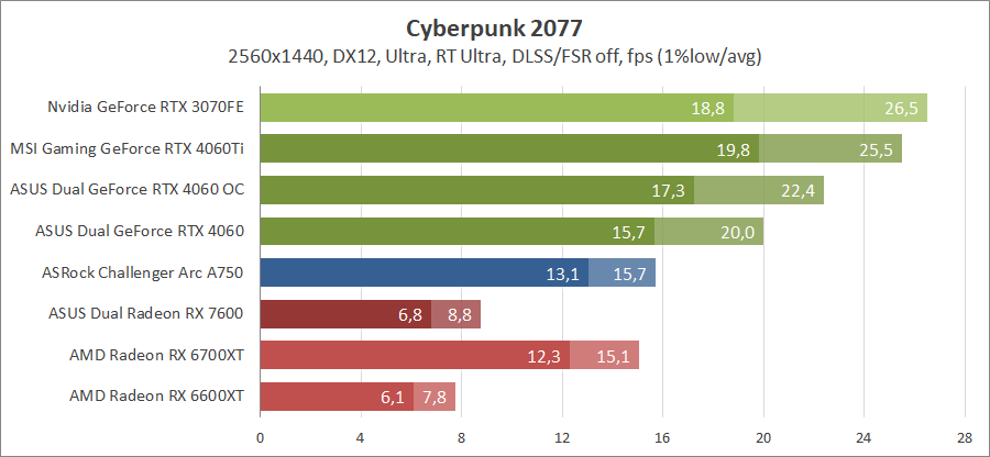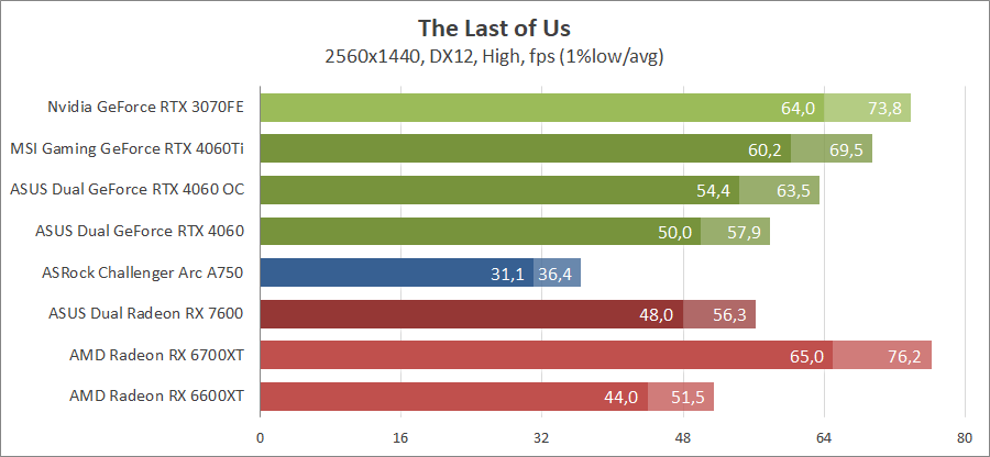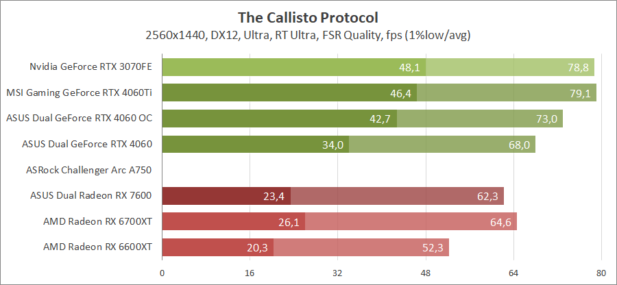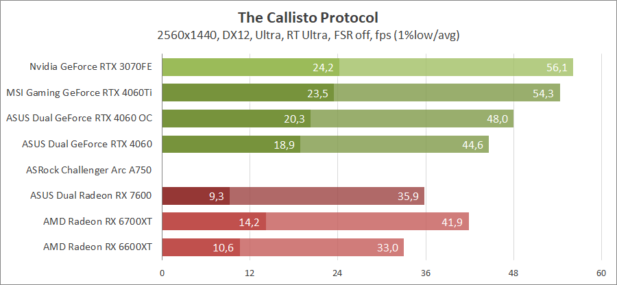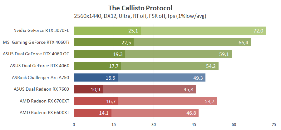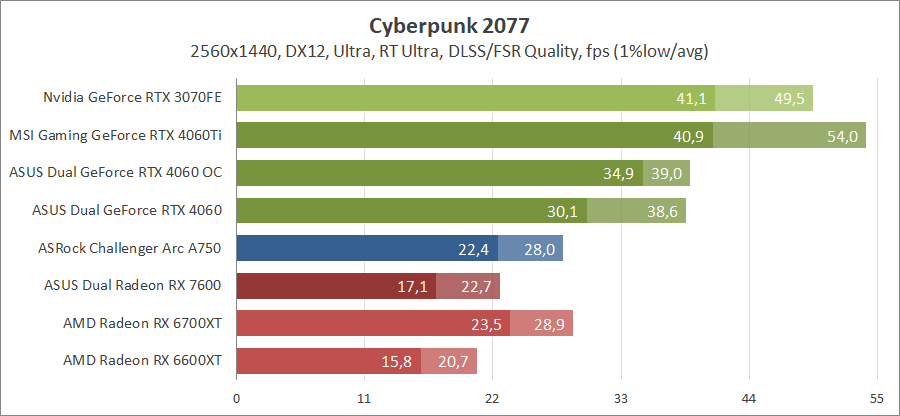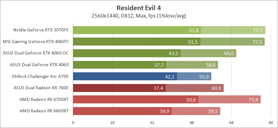 Здесь новинка немного отстает от Radeon RX 7600, разгон исправляет ситуацию. Для игры при разрешении 2560х1440 придется либо сбавлять качество графики, либо задействовать технологию масштабирования.