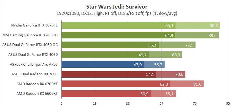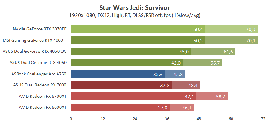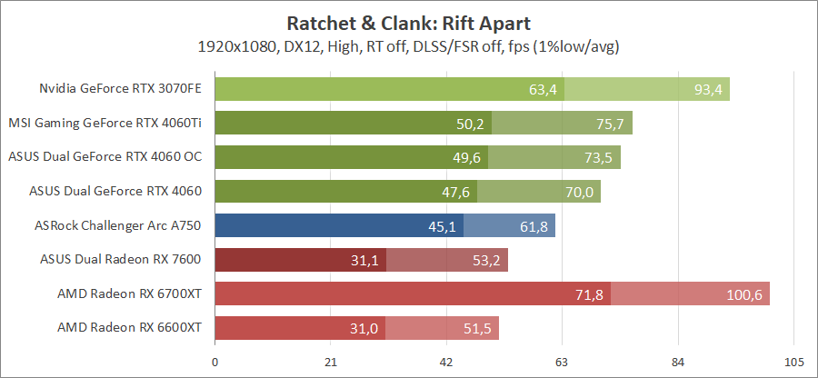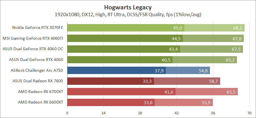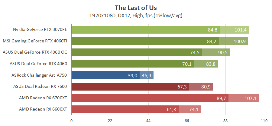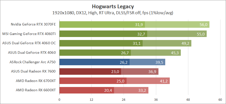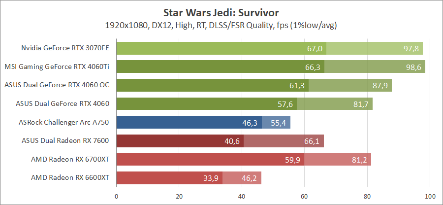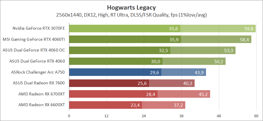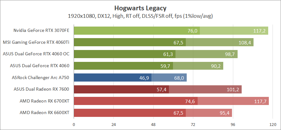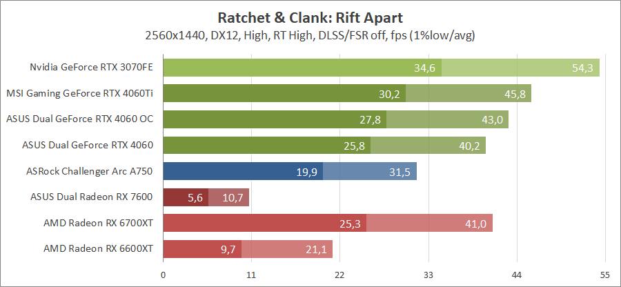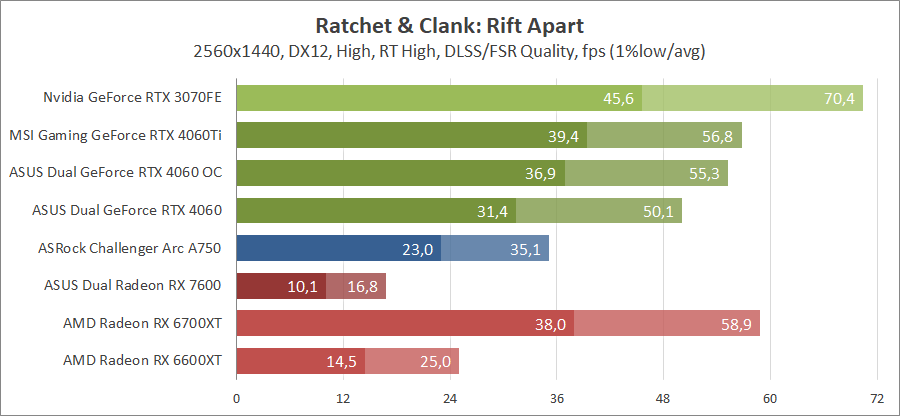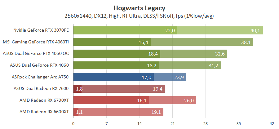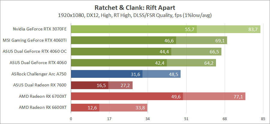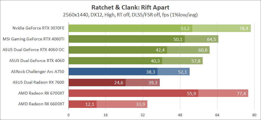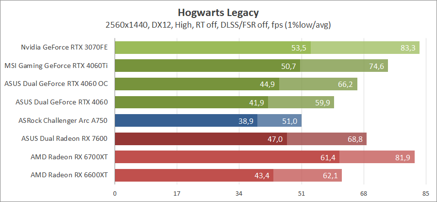 Тестирование в игровых бенчмарках происходило при разрешении 2560х1440 и 1920х1080 с прессетами качества графики High или Ultra. Также были добавлены режимы с активированными, где это возможно, параметрами трассировки лучей. Дополнительно проводилось тестирование с технологиями DLSS или FSR в трудных для видеокарт играх, для карты Arc A750 использовалась технология Intel Xess. В игре Hogwarts Legacy совершалась пробежка в течение минуты через городок Hogsmeade в сторону Old Fool, в Star Wars Jedi: Survivor, Ratchet & Clank: Rift Apart, Remnant II и Resident Evil 4 совершалась прогулка в течение минуты в начале стартового уровня, в The Last of Us — на уровне после пролога.
