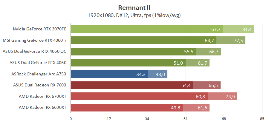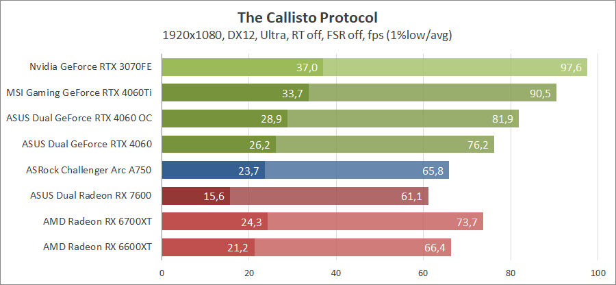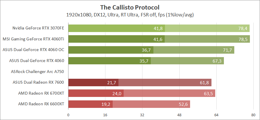 В этой игре у GeForce RTX 4060 неплохие показатели, но карты Redeon являются серьезными конкурентами. Включение трассировки лучей позволяет обойти их.