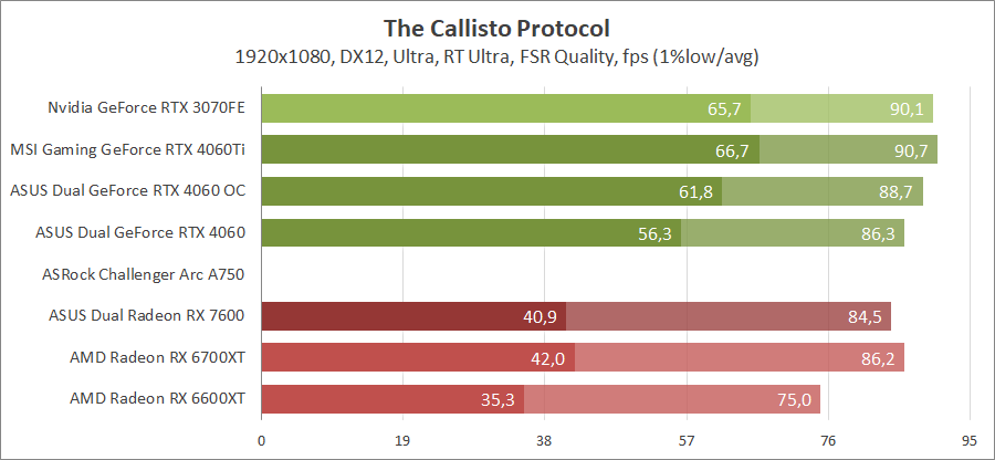 Здесь GeForce RTX 4060 обходит всех своих визави и конкурирует с Radeon RX 6700 XT, при активировании FSR 2 вообще догоняет старшие адаптеры Nvidia.