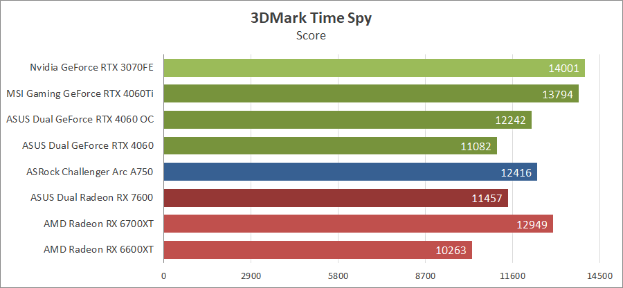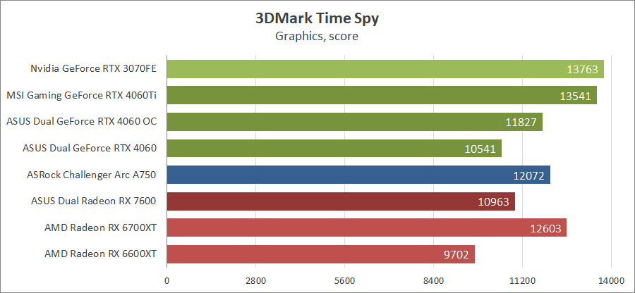 В старом Time Spy видеокарта GeForce RTX 4060 смогла обойти нового конкурента только с разгоном, тогда как в тестах с активированной трассировкой лучей она соперничает уже с Radeon RX 6700 XT.