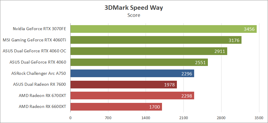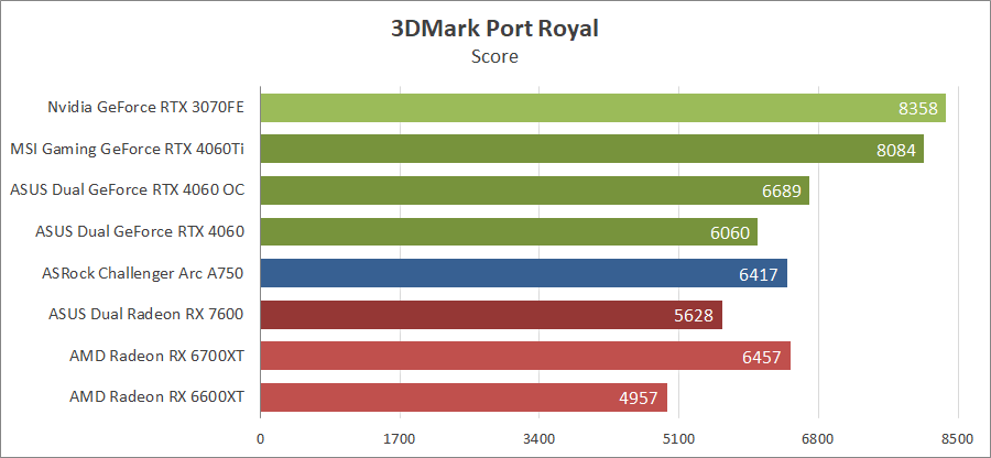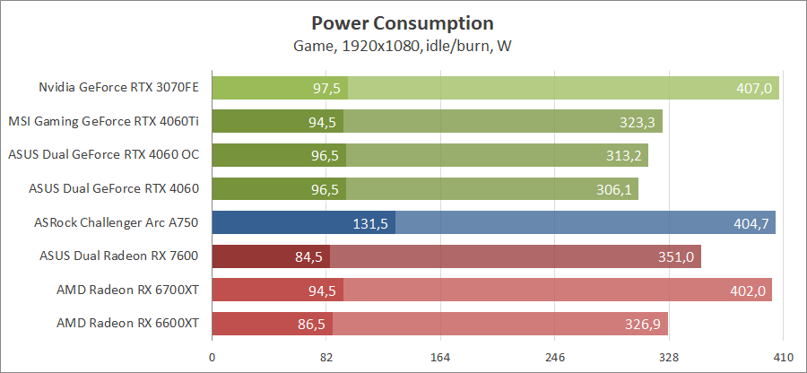 Для сравнения возьмем карты из прошедших тестирований, а именно MSI GeForce RTX 4060 Ti Gaming X Trio 8G, ASRock Arc A750 Challenger D 8GB OC и ASUS DUAL-RX7600-O8G. Также добавим к ним Nvidia GeForce RTX 3070 FE, AMD Radeon RX 6700 XT и Gigabyte GV-R66XTGAMINGOC PRO-8GD.