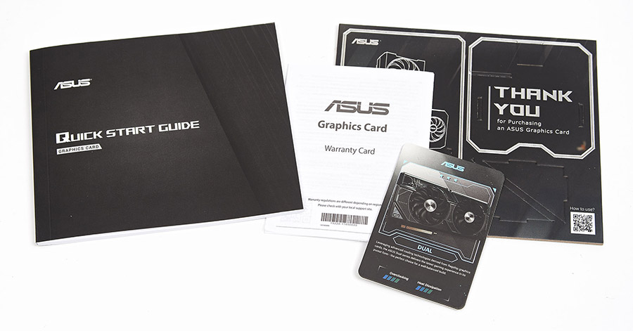 Карта поставляется в темной коробке средних размеров, спереди которой изображено устройство, а на обратной стороне указаны его характеристики. Видеокарта относится к обычной серии Dual, предназначенной для массовых и неприхотливых пользователей. Но, несмотря на свое позиционирование, у нее заводской разгон, на что намекает приставка OC Edition.