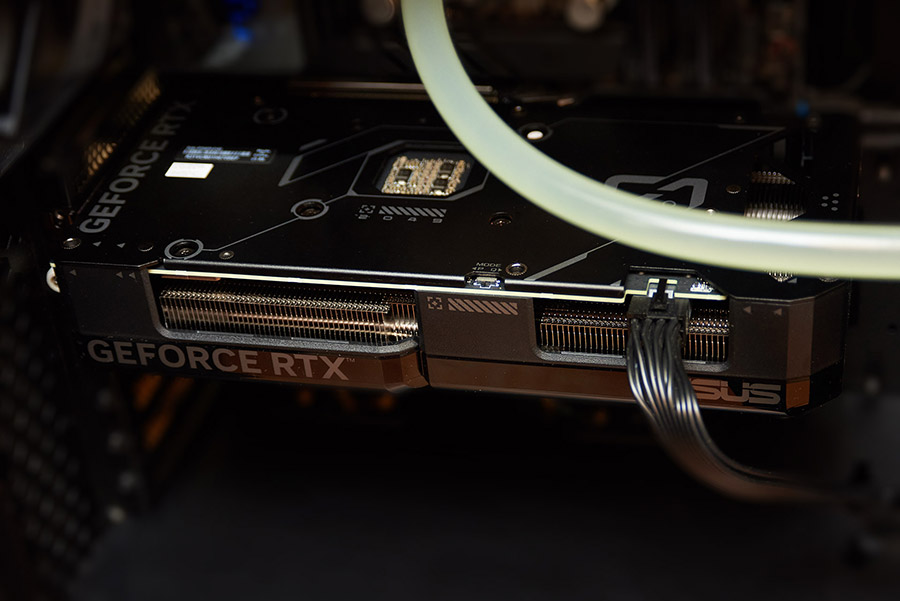 Сверху на обратной стороне видеокарты есть переключатель между тихим или производительным режимами.