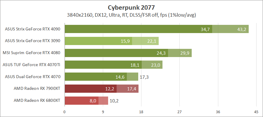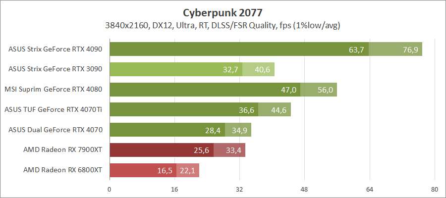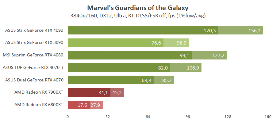 Благодаря хорошей оптимизации карты GeForce вальяжно чувствуют себя в этой игре. При активировании лучей заметен небольшой разрыв между новой моделью и GeForce RTX 3090. В целом разница между ними составляет около 15–30 процентов.