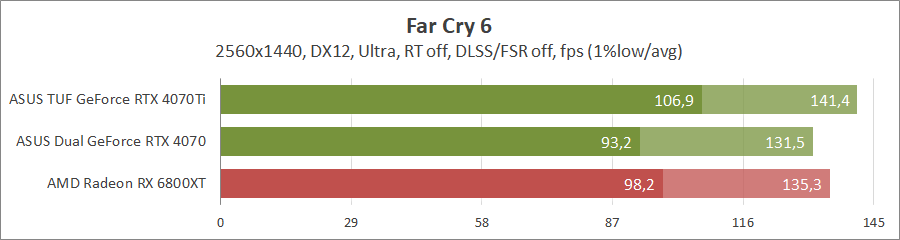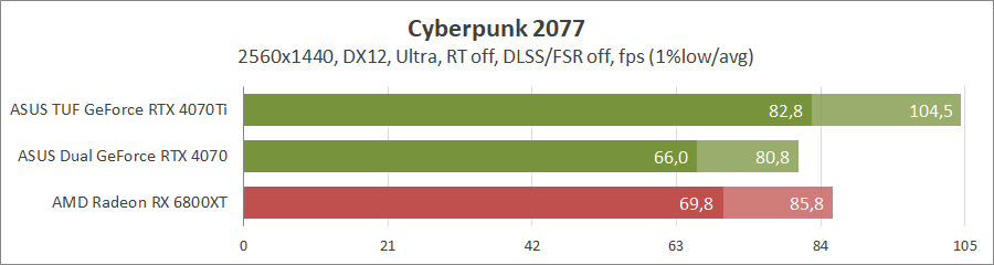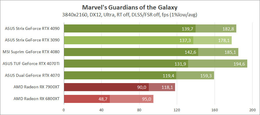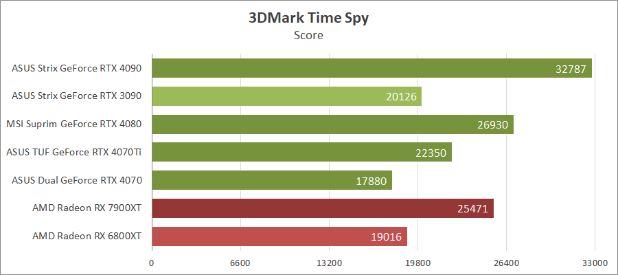 Для сравнения возьмем карты MSI GeForce RTX 4080 16G Suprim X, ASUS ROG-STRIX-RTX4090-O24G-GAMING, ROG-STRIX-RTX3090-O24G-GAMING, TUF-RX7900-O20G-GAMING и референсную модель Radeon RX 6800 XT, которые были в прошлых тестированиях. Также возьмем ASUS TUF-RTX4070TI-O12G-GAMING.