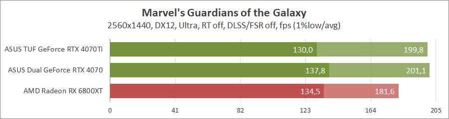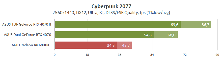 В 2К уже можно наслаждаться графикой, GeForce RTX 4070 значительно лучше, но активация масштабирования уменьшает разницу.