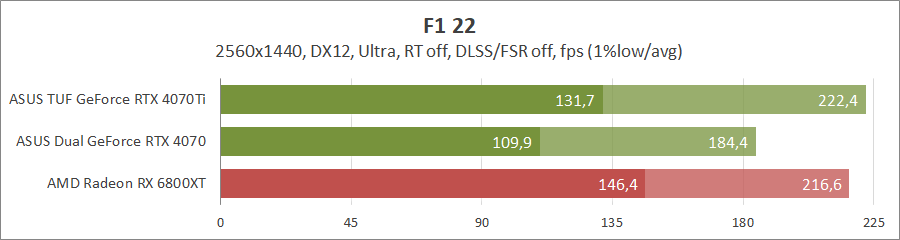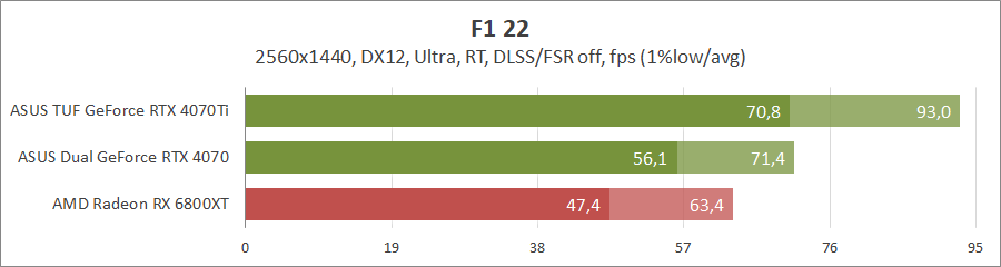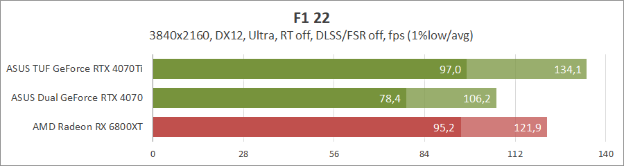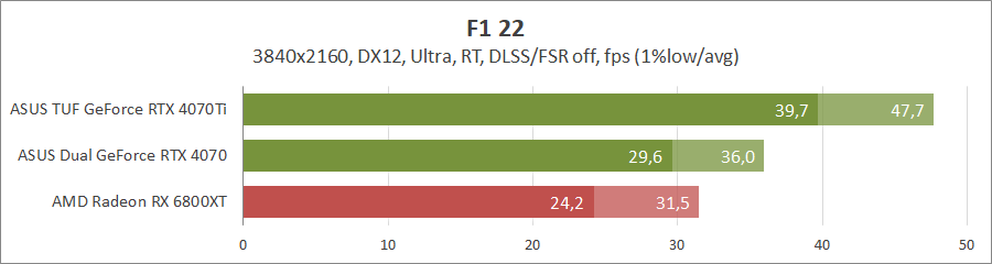 Прошлогодние гонки F1 без лучей лучше чувствуют себя на картах Radeon, а вот их активация передает пальму первенства уже «зеленым» конкурентам. Как и в предыдущих тестах, GeForce RTX 4070 отстает от старшей модели на 25–30 процентов.