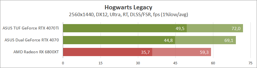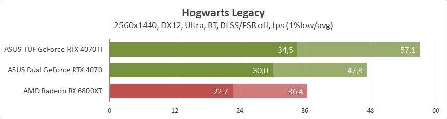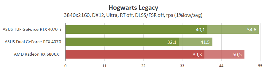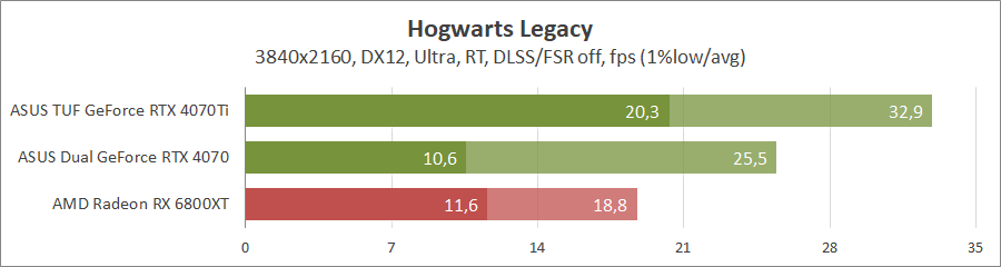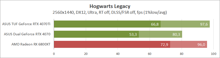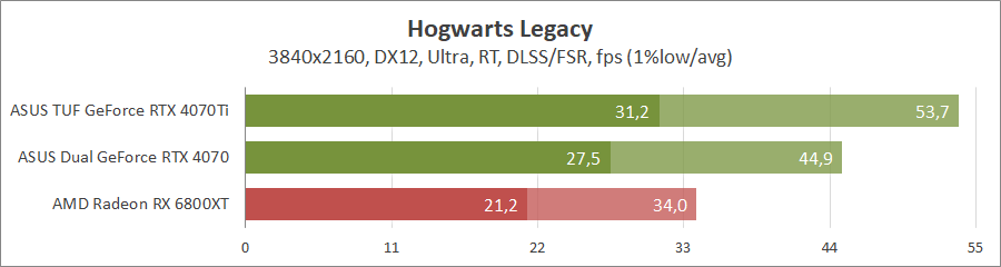 Тестирование в игровых бенчмарках проходило при разрешении 3840x2160 и 2560х1440 с пресетами качества графики Ultra, но не все карты уже были доступны с использованием новых проектов. Также были добавлены режимы с активированными, где это возможно, параметрами трассировки лучей. Дополнительно проводилось тестирование с технологиями DLSS или FSR в трудных для видеокарт играх. В Hogwarts Legacy происходила пробежка в течение минуты через городок Hogsmeade в сторону Old Fool с автоматической постройкой пути на игровой карте. 3DMark использовался со стандартными настройками.